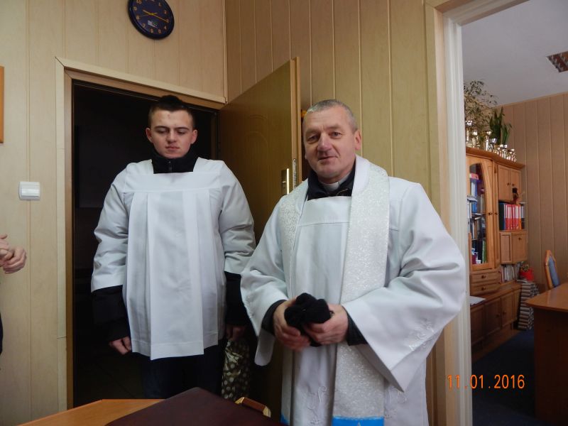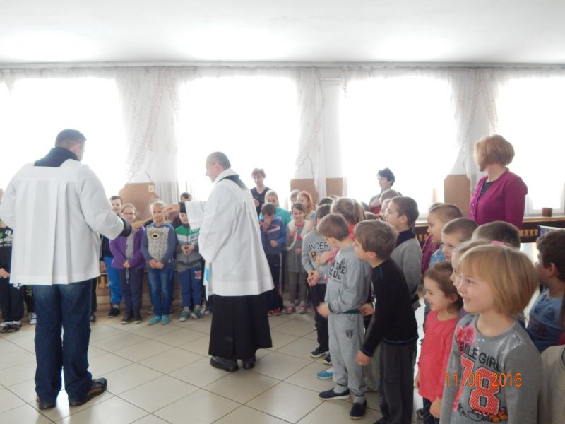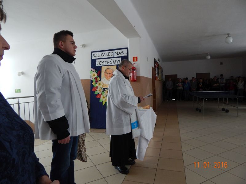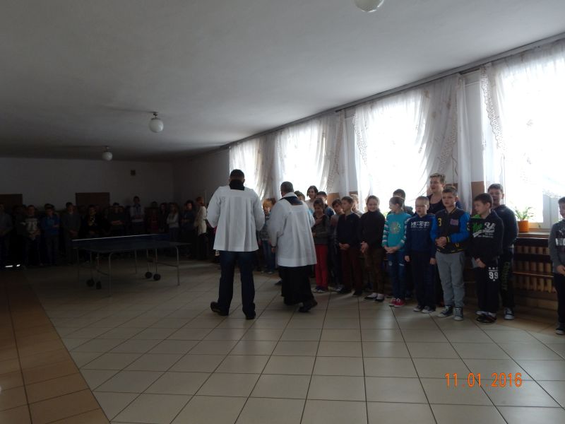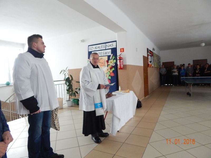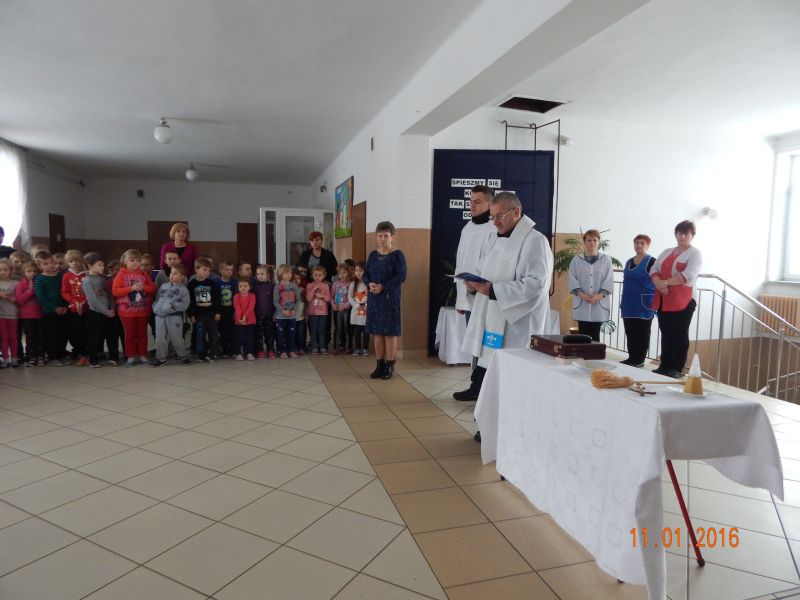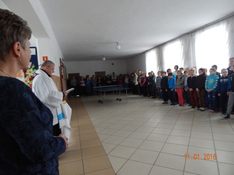W dniu 11.01.2016r. z odwiedzinami duszpasterskimi przybył do naszej szkoły ksiądz wikary Andrzej Gola. Przygotowaliśmy na tę uroczystość stół nakryty białym obrusem, na nim – palącą się świecę oraz kropidło z wodą święconą. Po powitaniu przez Panią dyrektor Urszulę Zielonka nastąpiły modlitwy prowadzone przez księdza potem był śpiew kolęd w wykonaniu społeczności szkolnej i błogosławieństwo udzielone wszystkim uczniom, nauczycielom i pracownikom szkoły.